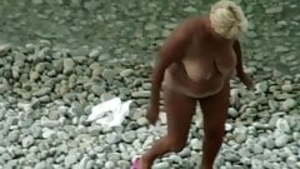 Dicke Frau mit Braeunungsstreifen beim FKK