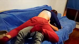 Lüsterne Stiefschwestern ficken ihre großen Stiefbrüder auf dem Sofa