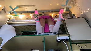 Fickgeile Sekretärin ohne Höschen in blauer Röhre probiert durchsichtige Strümpfe