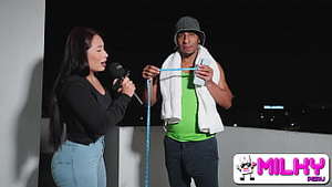 Naty Black, die dicke kleine Schlampe, reitet den riesigen schwarzen Schwanz und trinkt das Sperma der Kerle!