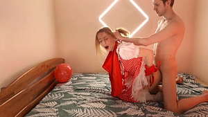 Milf im roten Cosplay wird hart anal gefickt und tief durchgedrohtet