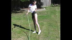 Zoe bespritzt ihre durchstochenen Titten und ihre Muschi mit dem Wasserschlauch